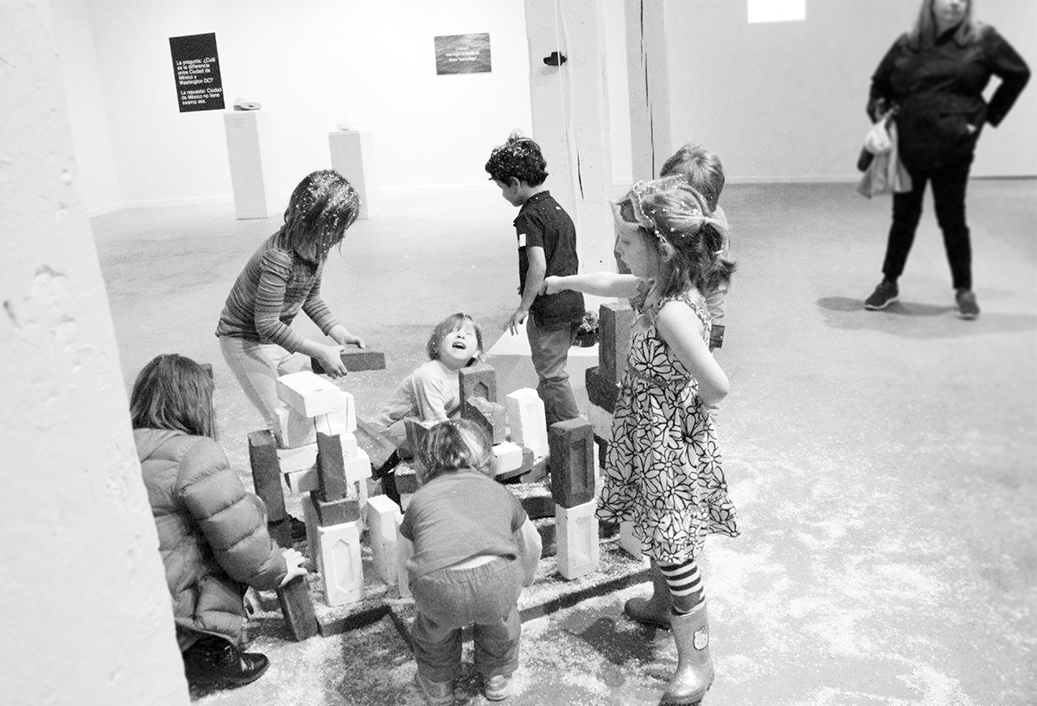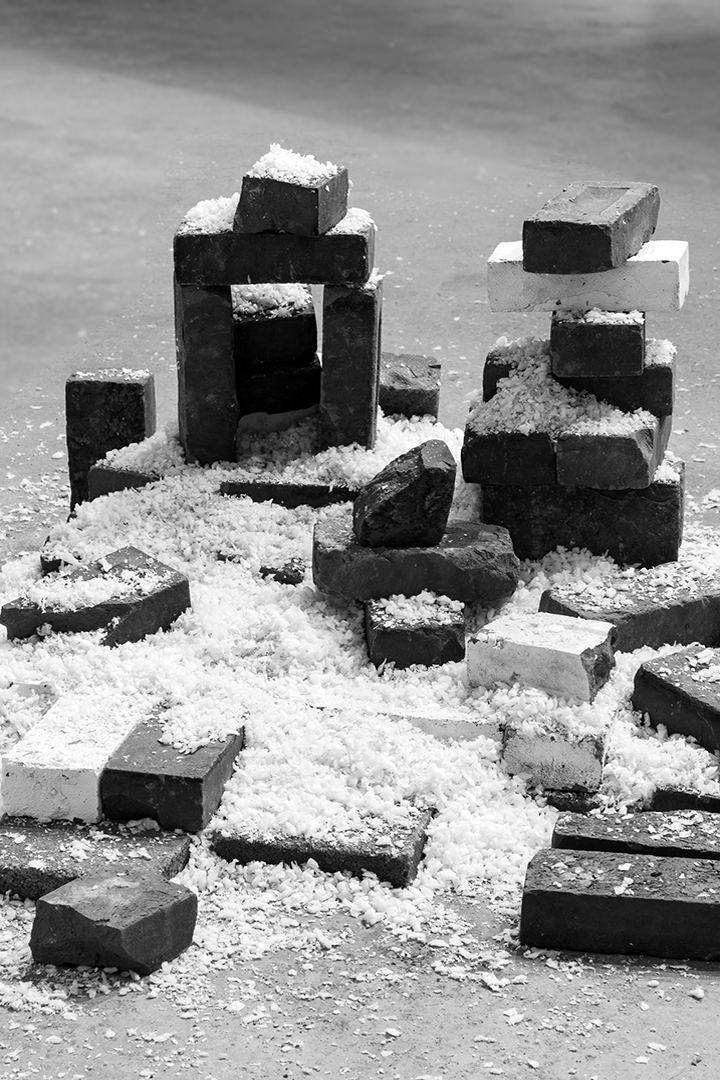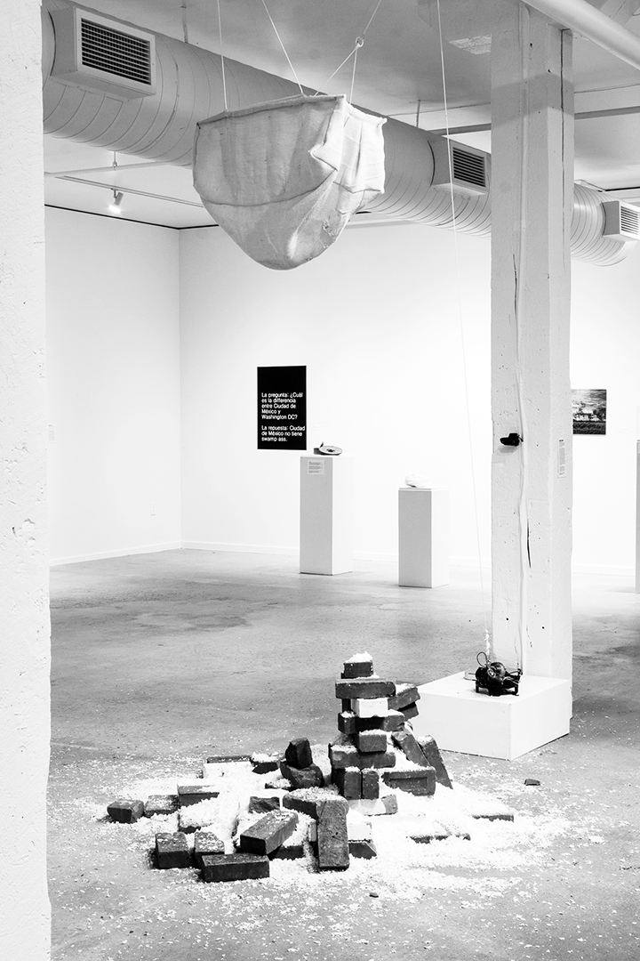This interactive installation was conceived as a microcosm of our current and trans-historical political climate. As such, it is a hostile space. Construction materials – brick, canvas, rope, and repurposed motors – are layered against the seemingly invisible technologies of digital surveillance. Custom software and physical computing activate a handmade cradle dropping theatrical snow. Viewers engage the work by building or deconstructing brick structures. Conversations around acculturation, assimilation, notions of “passing”, and other aspects of conceptual whiteness unfold through performances, viewer interactions, and public forums.