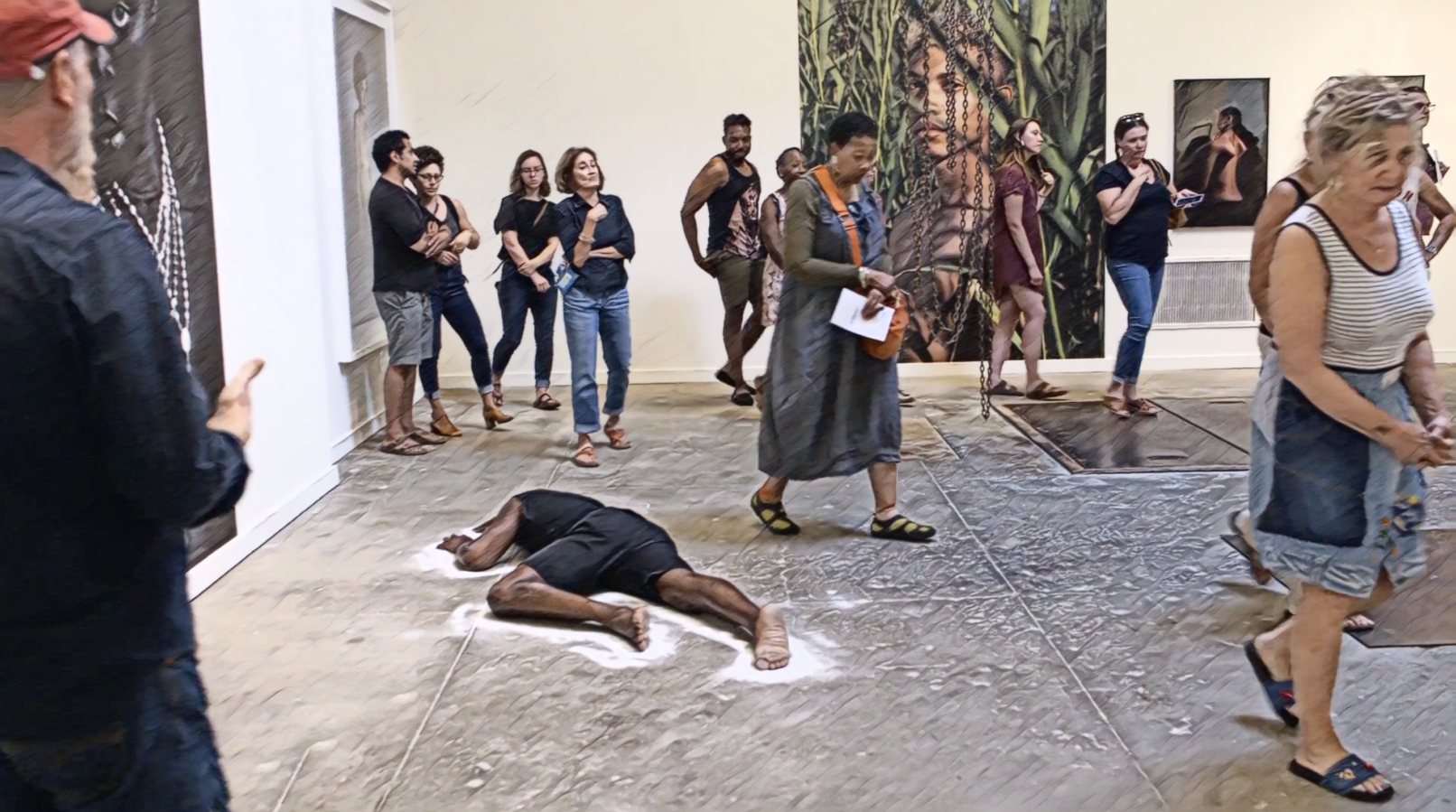 This performance art provocation addresses the repulsive circulation of Black death imagery, still widely practiced by museum spaces, media channels, and social media platforms. Far from eliciting empathy, traumatic imagery often perpetuates harm through visual spectacle. This original score implicates viewers who