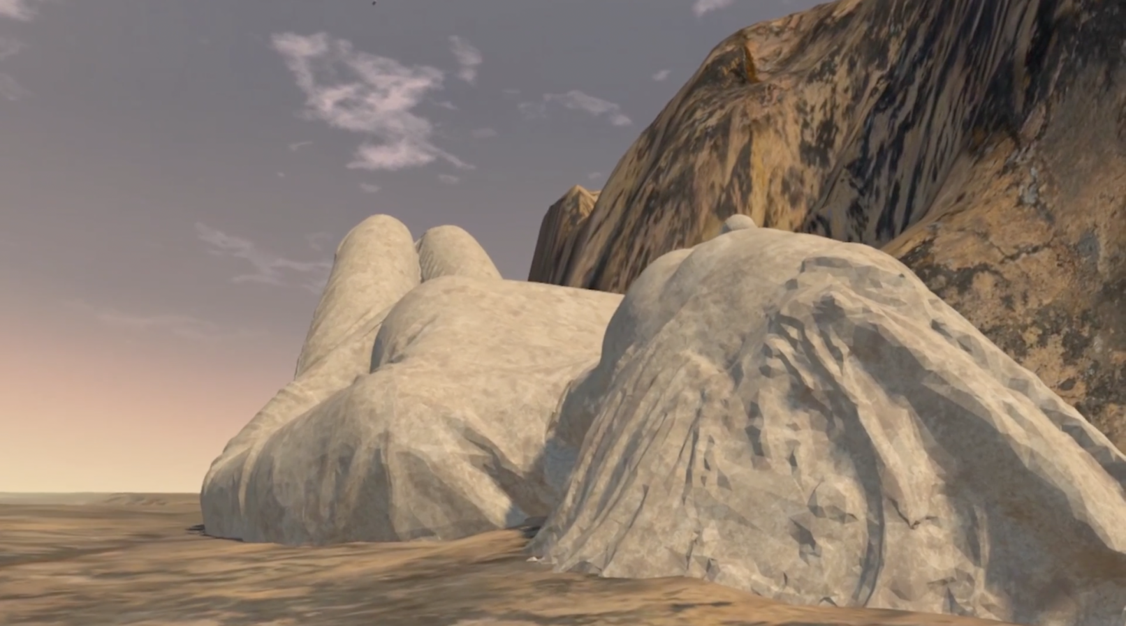 The virtual reality (VR) experience invites viewers to walk through a sparse mountainous terrain, collecting fragments along the way. Following instruction to “seek the edges,” they explore a centralized basin dotted with raw, clay-like replicas encased in a digital shell. At the outer ridge, monumental female figures emerge from the rocky perimeter. Once transported to a secret library, viewers see their collected artifacts appear as fully rendered physical replicas.